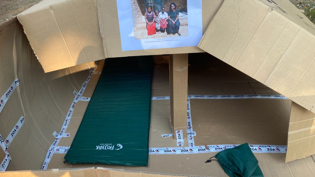 Op het terrein naast De Eshof zijn kartonnen hutten gebouwd om de nacht door te brengen. Op de hutten hangen foto's van gezinnen die altijd in dit soort 'krotten' wonen. Het maakt bewust van de omstandigheden, waar soms best grote gezinnen dag en nacht moeten vertoeven. Of er daadwerkelijk geslapen wordt in de nacht is altijd maar de vraag met zoveel tieners. Er zijn in ieder geval heel veel leuke activiteiten om de kinderen moe te maken. De dag staat bol van sport en spel. Om 18.00 uur werden er stapels pannenkoeken gebracht door ouders, een goede bodem voor een lange nacht (voor de begeleiders?). De voorspellingen voor de nacht zijn goed, in geval van 'nood' staan de deuren van De Eshof open voor de jeugd.