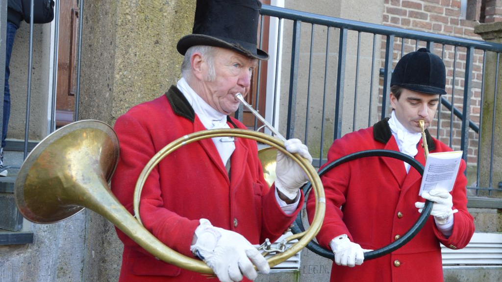 HOEVELAKEN - Geen (nacht)vorst, geen enorm natte velden, een stralend blauwe lucht en een heerlijk zonnetje: De perfecte ingrediënten voor de Slipjacht in Hoevelaken en omgeving. Het was alweer een paar jaar geleden dat de Hoevelakers de hoefijzers op de straten hoorden tikken, maar deze zaterdag 28 januari stond het Van Aalstplein vol paarden en hun ruiters, honden die er duidelijk zin in hadden en veel publiek dat afgekomen was op het mooie schouwspel. Nadat de hoornblazers hadden geblazen, heette burgemeester Renkema iedereen van harte welkom. Een 'proost' op de eerste run, die is gestart vanaf de Koedijkerweg. En daar ging de hele stoet met als stille getuigen een achtergelaten 'boodschap' op de klinkers.