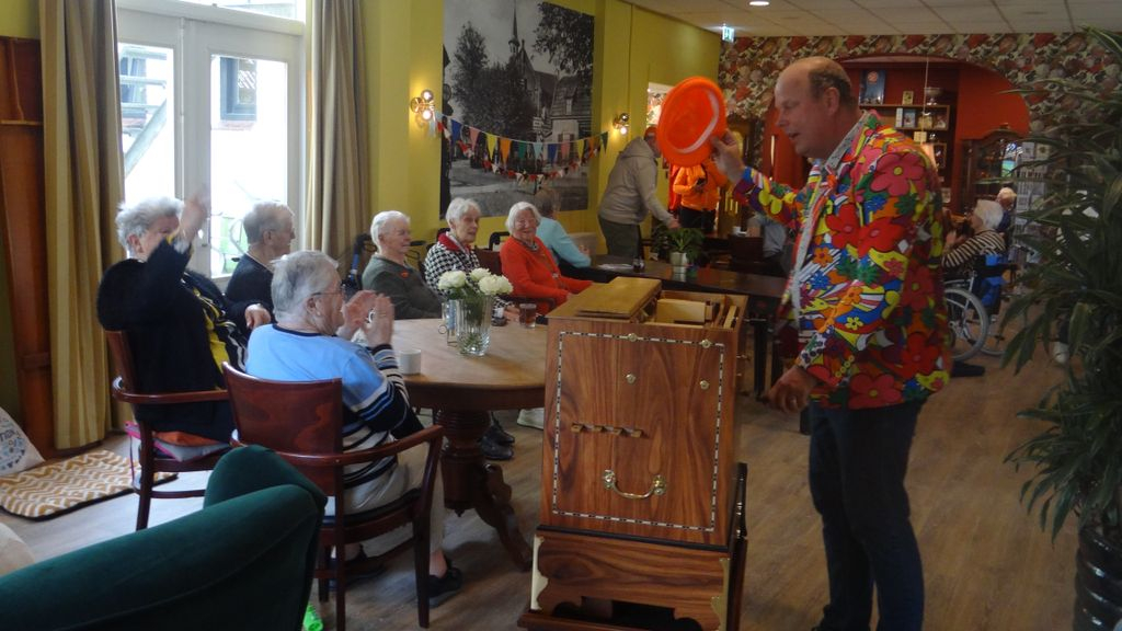 Zo konden de bewoners van zorginstellingen Seewende, Ittmannhof, de Bunterhoek, het Welgelegenhuis en Duyvenstaete ook de sfeer van Koningsdag proeven. Verantwoordelijk daarvoor waren de artiesten Henk van den Bos en Hiddo van Os. In Seewende en de Bunterhoek vermaakte Henk van den Bos de bewoners met zijn leuke liedjes en meezingers en wist hij bij menigeen de handjes in de lucht te krijgen. Maar ook wist hij de mensen verbazen met zijn act van het zwevende tafeltje, daarbij geassisteerd door één van de medewerksters.