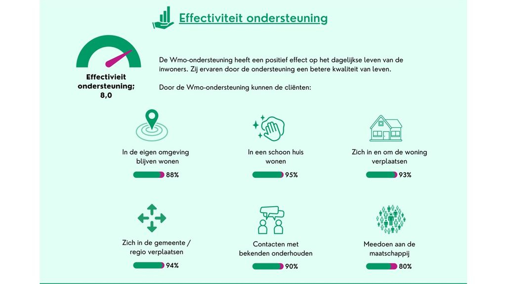 De WMO-consulenten krijgen een rapportcijfer van een 8. Ruim 90% is positief over de bereikbaarheid, begrijpelijkheid en empathie die de consulenten tonen, maar ook de mate van meedenken en het gevoel dat men serieus wordt genomen worden genoemd. 96% van de cliënten die gebruik maken van dagopvang/dagbesteding zijn hierdoor in staat om in de eigen omgeving te kunnen blijven wonen. 84% van de ondervraagden vindt de kwaliteit van de ondersteuning voldoende tot goed. "We zijn enorm trots op deze waardering van de Wmo-cliënten. Een groot compliment voor onze Wmo-consulenten; zij hebben bewezen goed bij de inwoners aan te sluiten", aldus wethouder Elskamp.
