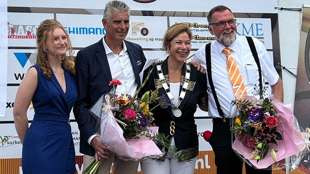 Na de prijsuitreiking verzocht burgemeester Céline Blom Henk Vis het podium te betreden en bedankte hem vervolgens voor zijn bijdrage aan de Wielerronde, door ruim 35 jaar betrokken te zijn geweest bij de organisatie en bijna 30 jaar als speaker alle toeschouwers gepassioneerd op de hoogte te hebben gehouden. Ook Jan de Kruijf kreeg een bloemetje overhandigd door Miss Nunspeet Kaylee voor zijn jarenlange inzet voor dit inmiddels niet meer weg te denken evenement in Nunspeet. Tevens kreeg de organisatie uit handen van de gemeente een waardebon van € 250 overhandigd voor het 50-jarig bestaan. Een mooie start voor de nieuwe lichting vrijwilligers die de organisatie wil gaan overnemen!