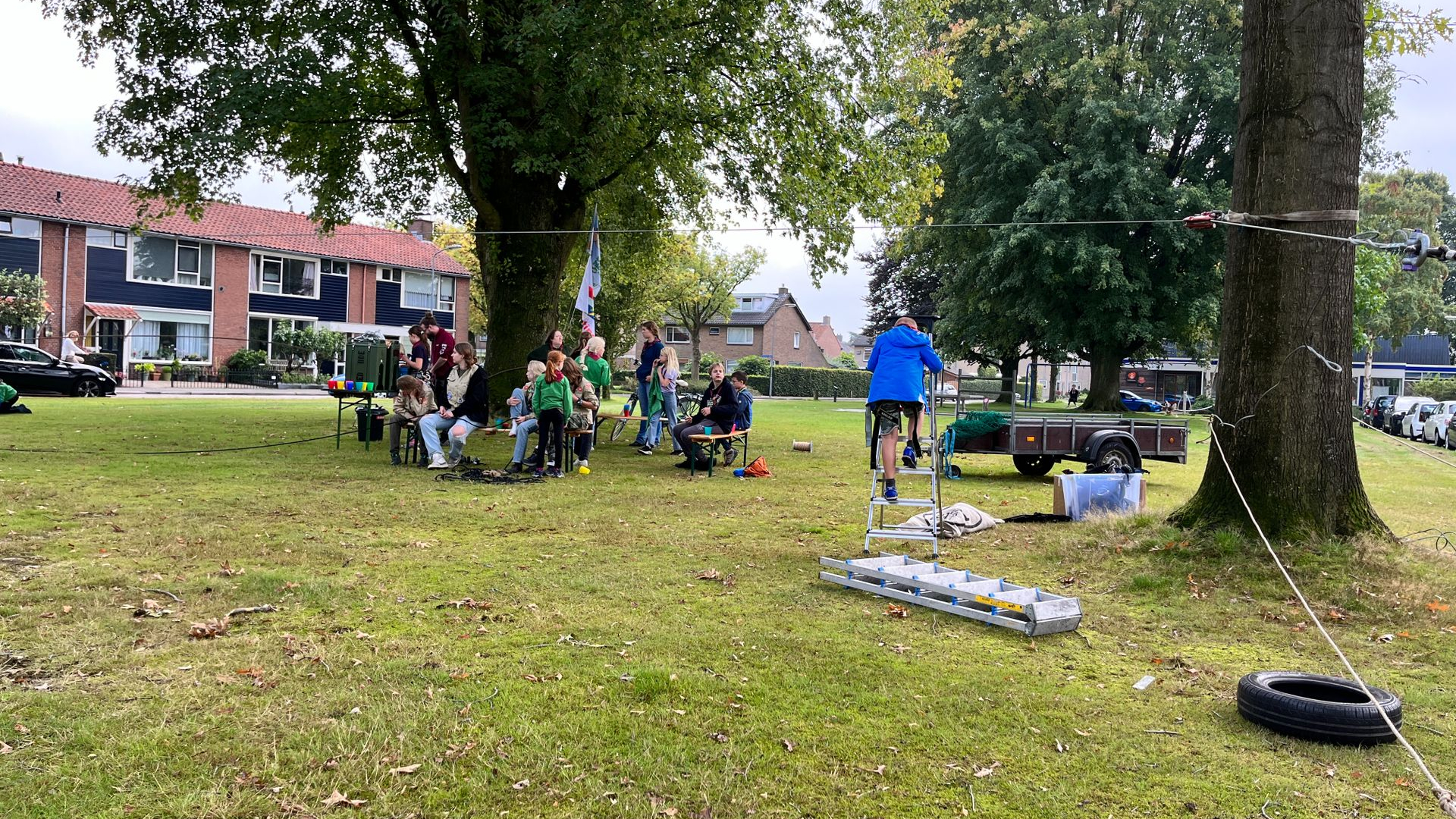 HOEVELAKEN - Op zaterdag 2 september opende de scouting in Hoevelaken haar scoutingseizoen. Overal in het dorp waren activiteiten uitgezet, zodat kinderen weer konden opstarten. Waar de Hiawatha- en scoutingvlag hing was een activiteit. Voor kinderen die in een nieuwe groep terecht waren gekomen - een groep hoger gegaan- was het ook fijn om de andere groepsgenoten zo te leren kennen. Aan de Meerveldlaan in Hoevelaken was een soort tokkelbaan opgezet tussen de verschillende bomen en sjeesden de kinderen op een stapel dozen af. Grote hilariteit tot gevolg. Voor de kinderen die niet actief waren, was er een boterham met pindakaas of wat te drinken. Even een rustmoment op de meegebrachte picknickbanken. Al met al een goede start voor een nieuw seizoen op scouting.