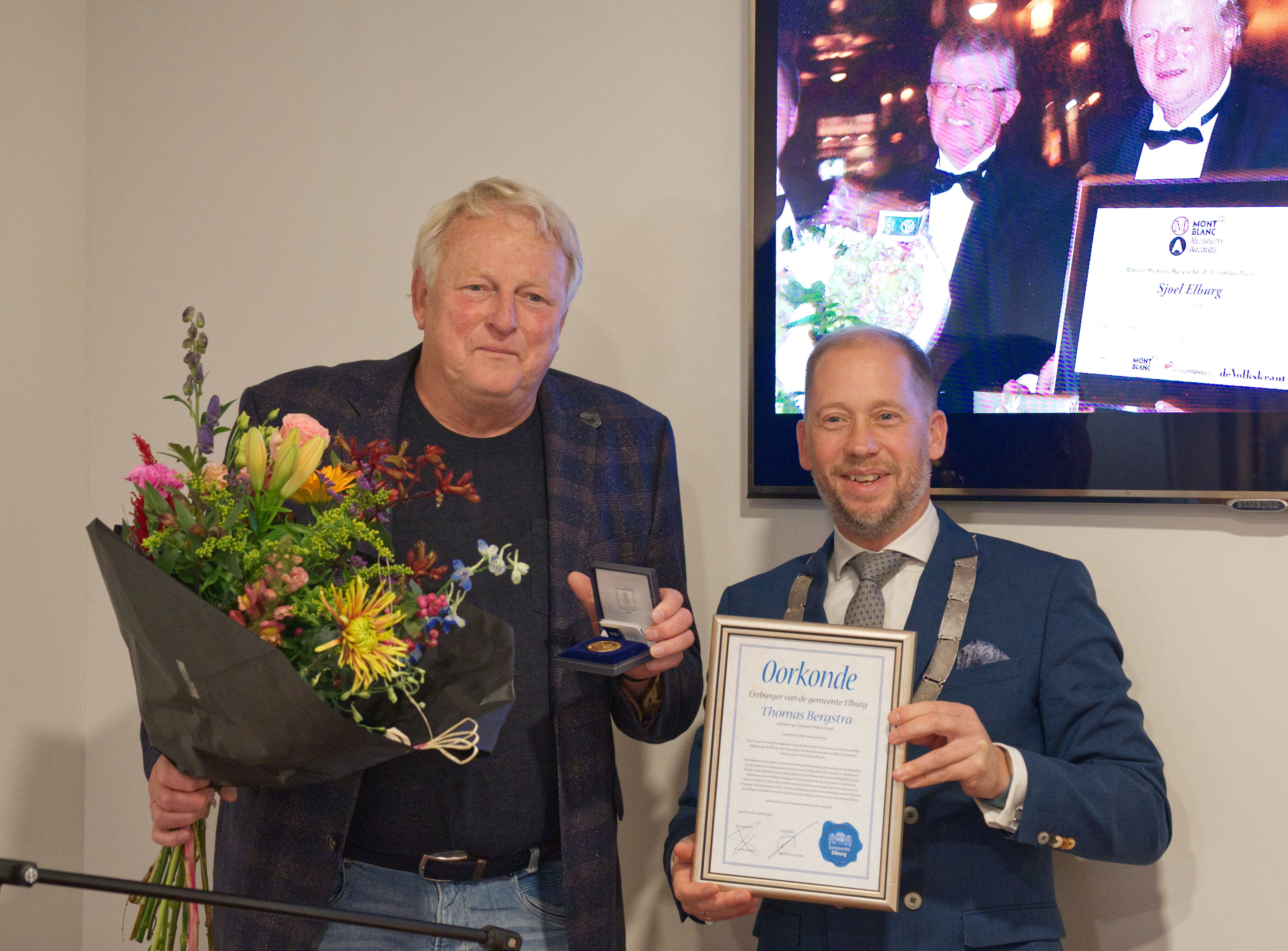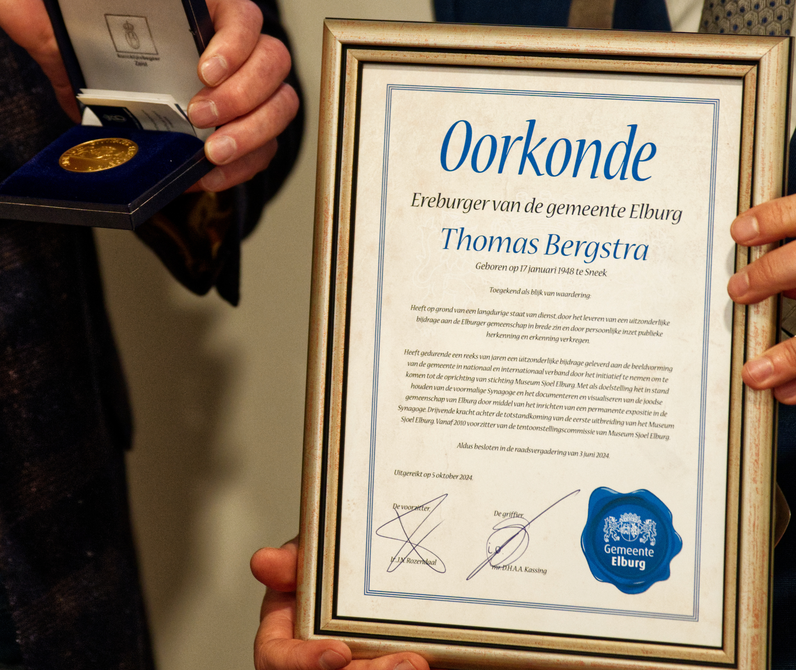 Naar goed gebruik is de kersverse ereburger volledig verrast met het uitroepen hiervan. “Wellicht dacht u dat ik hier ben vanwege de opening van de nieuwe tentoonstelling? Dat is ook waar. Wel kom ik speciaal voor u,” zei Jan Nathan Rozendaal tegen Tom Bergstra.