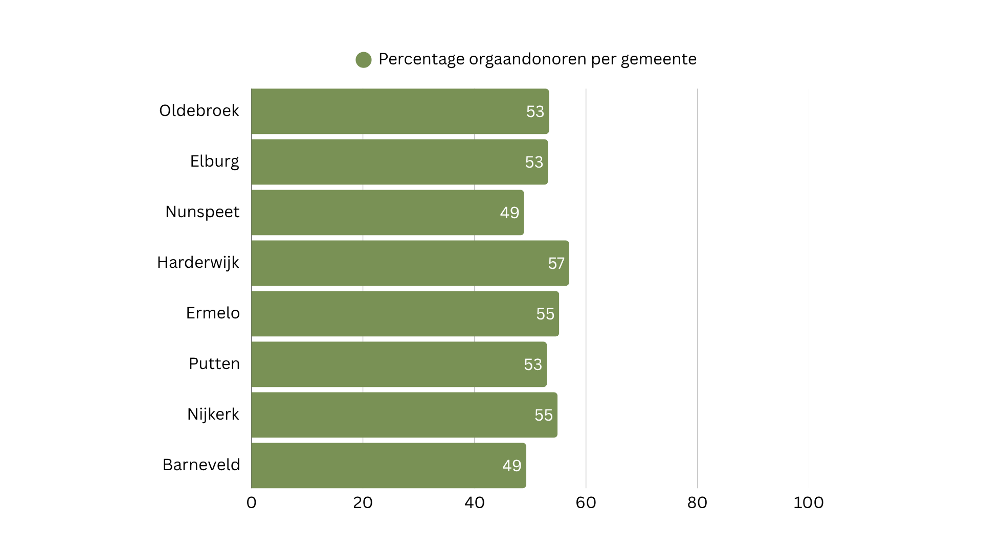 Per gemeente verschilt het percentage. Harderwijk kent met 57 procent de meeste orgaandonoren in de streek. In de gemeente Nunspeet ligt het percentage het laagst. Daar is 48,9 procent van de mensen orgaandonor.